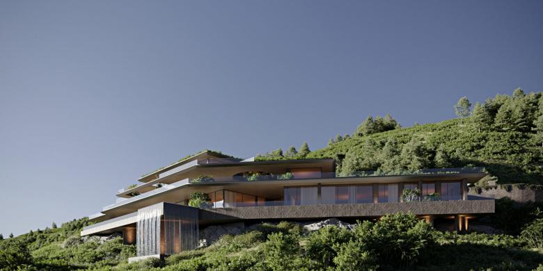 This architectural project on the intricate slopes of a breathtaking Portuguese island aimed to harmonize uniqueness with the location's natural essence. The villa's layout carefully preserved the vistas through expansive terraces and panoramic windows, utilizing cascading floors. The Falls Villa concept further incorporated water features, like a basement waterfall, while the villa's rooftop greenery rendered it nearly concealed when seen from above. Materials, including warm woods, slate stone, bronze details, and extensive glass, were chosen to honor the locale's character.