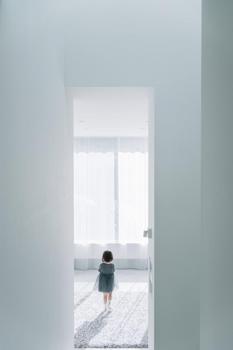 この大きな窓から光、風、音、そして時間のうつろいを感じ、一枚の揺らぐレースのカーテンが曖昧にやさしくそれらを繋ぐ。
