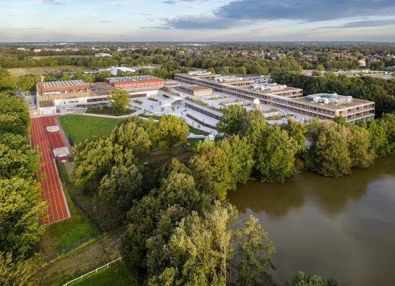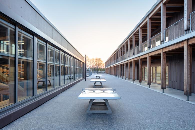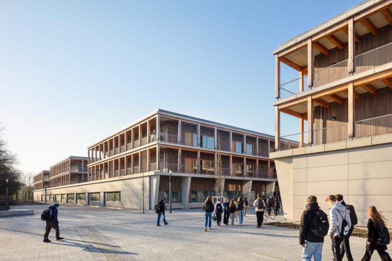 Die L-förmige Figur öffnet das Grundstück zum benachbarten Grünraum der Pferderennbahn und schottet die Schule von den Lärmemissionen der Straße im Westen und großen Parkplatz im Norden ab. Alle Sonder- und Gemeinschaftsflächen befinden sich im Erdgeschoss und sind von einem ringförmigen Boulevard aus direkt zu erreichen, welcher abwechslungsreiche und differenzierte Begegnungs-, Lern- und Loungeorte bietet. Aufgehende Lernhäuser in Holz-Beton-Hybridbauweise bieten den Jahrgangsstufen-Clustern aus 1700 SchülerInnen ein Zuhause. Umlaufende Balkone und Außentreppen ermöglichen, jeden Unterrichtsraum in den Außenraum zu erweitern und kurze Wege zu der auf dem Dach des EG befindlichen Pausenfläche oder zum nächsten Lernhaus. Der Rhythmus der Klassenhäuser und Höfe vereinfacht dabei die Orientierung und das Auffinden von Bereichen.