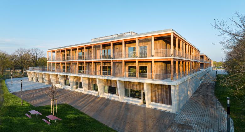 Nicht zuletzt verkürzt der hohe Anteil an Vorfertigung der Deckensysteme und Fassaden sowie der Verzicht auf Gerüststandzeiten für die Decken (Brettstapelplatten der Elementdecken wirken als Zugbewehrung UND verlorene Schalung) die Bauzeit des Projekts.