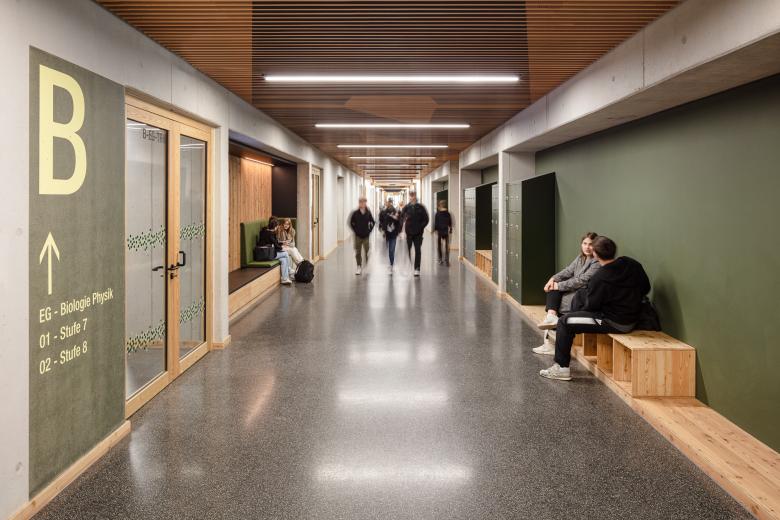 Der Rohbau wurde in Holz-Beton-Hybridbauweise erstellt. Erschließungskerne, Stützen und Gründung sind in Ortbeton konstruiert, sämtliche Decken in Holz-Beton-Verbundbauweise. In den Klassen- und Fachraumbereichen kamen Fertigteile aus Brettstapelplatten und Aufbeton (so genannte Elementdecken) zur Anwendung. In den Großräumen (Sporthallen, Mensa und Aula) wurden ebenfalls Holz-Beton-Elementdecken auf Holzbalkenlagen verbaut.