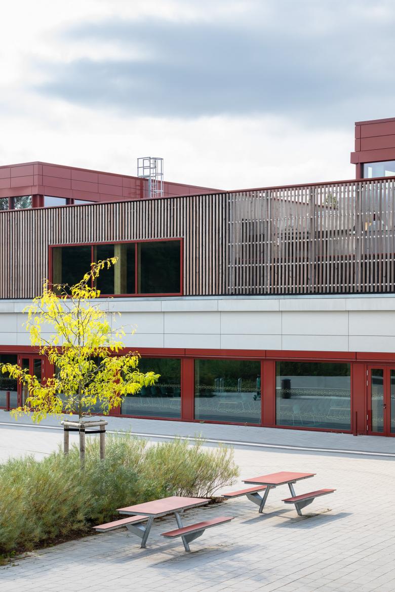 In die Brüstungen der obergeschossigen Laubengänge vor den Klassenräumen sind Bepflanzungskästen integriert, die von den Schülerinnen und Schülern gepflegt werden und sich ebenfalls positiv auf das Mikroklima und die Atmosphäre der Räume auswirken. Sämtliche Glasflächen erhielten zusätzlich zu den Dachüberständen einen außenliegenden Sonnenschutz aus Aluminium-Horizontallamellen, die gleichzeitig Lichtlenkfunktion übernehmen.
