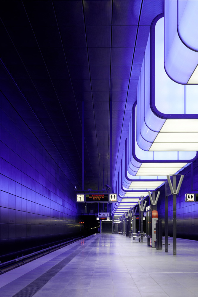 Der Bahnsteig wirkt wie ein hell ausgeleuchteter „Steg“ innerhalb des Raums; über dem Bahnsteig schweben 12 leuchtende „Lichtbehälter“. Sie erzeugen durch ihre Lichtqualität spektakuläre Perspektiven und eine faszinierende Raumwirkung.