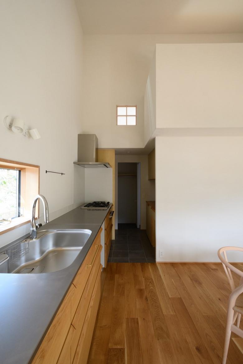 これらの要望を受け、主室をダイニング・キッチンとし、緑と食を通じて家族がくつろぎ、豊かな暮らしが出来ないかと考えた。小さな家の設計で重視するのは、空間のつながりと視線の抜けである。そこで、平面的にはコンパクトながらも、気積のある空間にしたいと考えた。主室を4.5m角の平面形状とし天井の高さも4.6mの吹抜けとし、立体的に大きな気積のある空間とした。そして外部のウッドデッキと繋がる開口部は、1.5m角と小さくすることで、外部からの視線を遮りながらも、庭の緑を眺められるよう設計した。リビングは、畳敷の座の空間でくつろげるようにし将来はご夫婦の寝室となる。吹抜けに面してあるスタディーコーナー、子供室となる個室はあえて仕切らず一体空間と知ることにより、違う階にいても家族の気配を感じられる様にしている。2階の廊下には天井まで一面の本棚を設け、その奥に書斎兼クローゼットを設けた。リモートワーク等で籠れるようにあえて低い開口部とした。