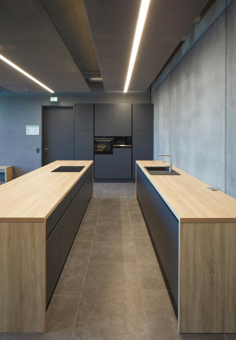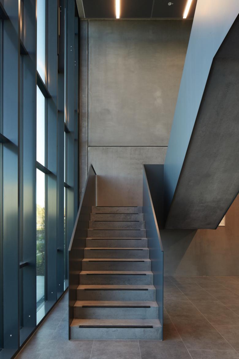 Die zweigeschossigen Glasfassaden beider Bauteile verbinden die Nutzungseinheiten zu einer gestalterischen Einheit. Diese entsprechen dem Innenraum mit dem Eingangsfoyer der Verwaltung und dem 2-geschossigen Verkaufsraum im Logistikbereich. Das Wechselspiel der Fassaden von offenen und geschlossenen Flächen sowie die farbliche Einheit der verwendeten Materialien unterstützen dieses Prinzip.