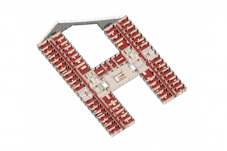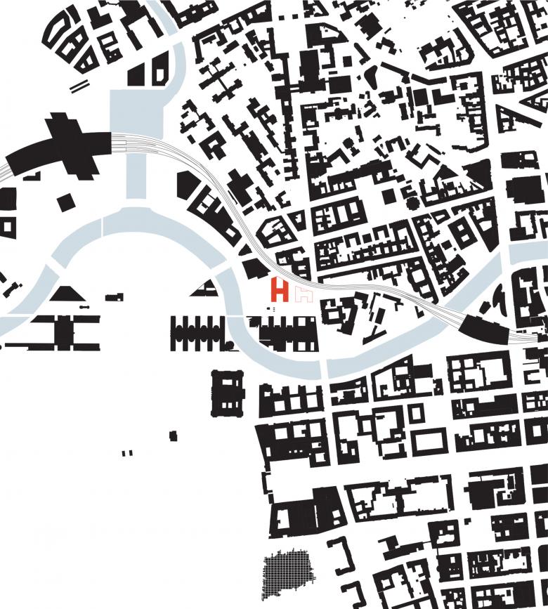 Durch die H-Formation ergeben sich zwei Gebäudeteile mit unterschiedlichen Qualitäten und ihren Höfen: der südliche Teil bietet sich als Cour d’honneur an, über den man die halböffentlichen Bereiche und die großzügige Treppenanlage erreicht. Der nördliche Teil – durch eine Glaswand gegen den Lärm der Stadtbahn geschützt - beherbergt einen grünen Innenhof, den Hauptsicherheitsbereich und die meisten der 400 Büros.