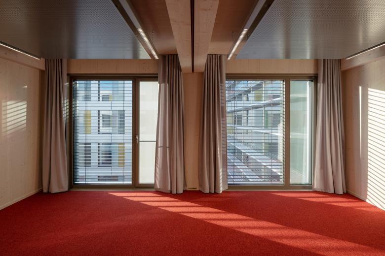 Alle Büros wurden als vorgefertigte Massivholzmodule konzipiert. Werkseitig werden Fensterelemente, ein Holzrahmen mit Wärmedämmung und integrierter Sonnenschutzanlage und eine Unterkonstruktion für die Fassadenbekleidung aus farbigem Glas in das Modul eingebaut. Lediglich die Bodenplatte, die Technikräume im Erdgeschoss und das zentrale Atrium werden in Stahlbetonfertigteilbauweise errichtet. Das Materialkonzept der Innenräume folgt der konstruktiven Logik dieser Hybridkonstruktion, die Rohbaumaterialien Holz und Beton bleiben hier sichtbar.