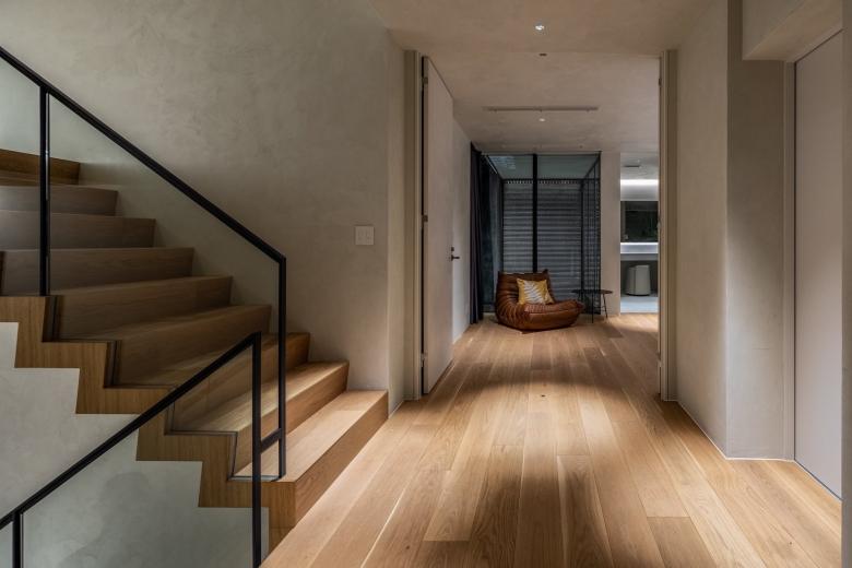 屋内外には緑化された中庭やバルコニーといった自然が点在し、硬質な建築の輪郭を優しく包み込む。アプローチを進むと地下のドライエリアから植物が伸び、既存の建物との間を柔らかく仕切る。玄関に入ると、ホール先の突当たりには地下のドライエリアから伸びる植物が窓越しに見え、南西から差し込む光がホールの行き先を照らす。2階の主寝室にはバルコニーが隣接し、光と風景を取り込むことで、日常に小さな自然との対話が生まれる。地下ではセットバックした壁面により生まれた庭が、ゲストルームやジム、プールに自然光を届け、地中にありながらも明るく穏やかな空間を実現している。3階のキッチンの西面には隣接する中庭を借景として大きな開口部が設けられ、光と風景がやわらかく内部に流れ込む。また広々とした東面のバルコニーには豊かな植栽が施され、屋上テラスは都市のパノラマビューを背景に、集いの場として機能する。