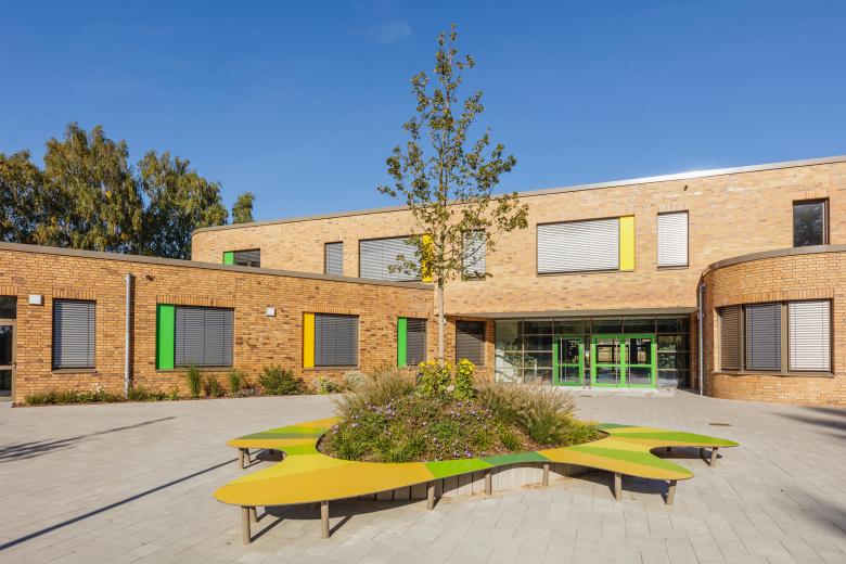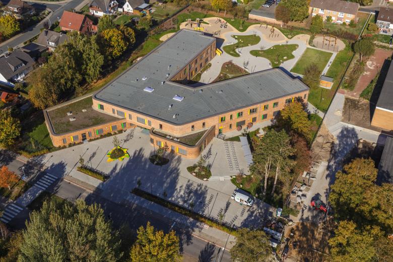 Die h-förmige Gebäudestruktur nimmt Bezug auf die Umgebung und schafft geschützte Außenbereiche für Spiel, Sport und Pause. Die Backsteinfassade sowie farbige Akzente an Fenstern und Türen setzen gestalterisch regionale Bezüge und geben der Schule eine freundliche Ausstrahlung.