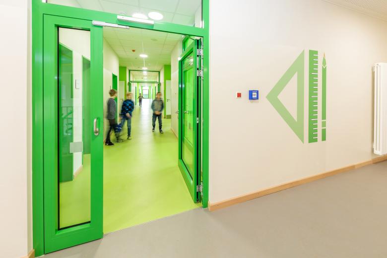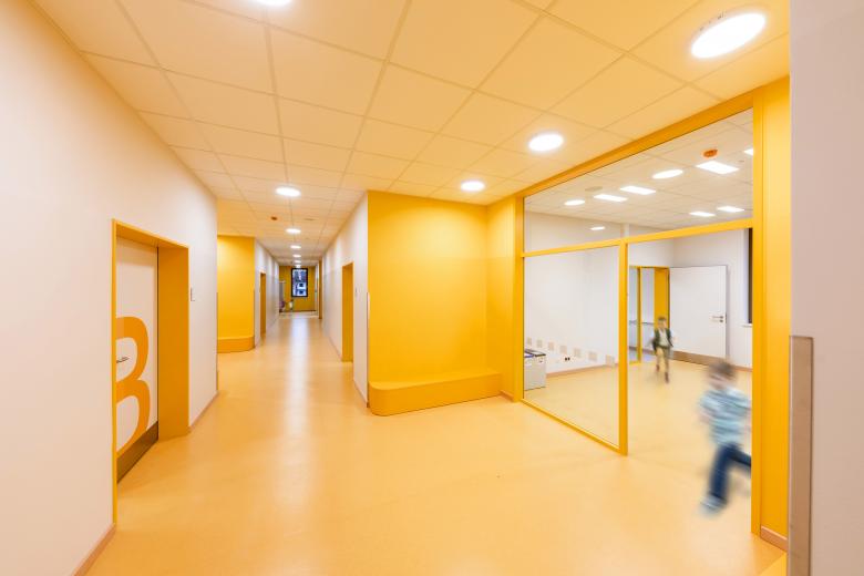 Innen zeigt sich die Schule als farbenfroher Erlebniswald. Grün, Gelb und Orange weisen den Weg durch die Lernlandschaften, große Piktogramme und Symbole helfen bei der Orientierung. Das lichtdurchflutete Foyer ist als Aula und Veranstaltungsraum multifunktional nutzbar. Lichtkuppeln und Leuchten fördern eine angenehme Aufenthalts- und Lernatmosphäre.