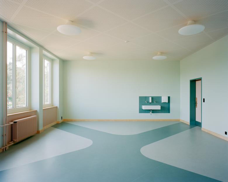 Die ursprüngliche Farbigkeit und Materialisierung der Innenräume zeugte entsprechend den entwerferischen Vorlieben von Julius Maurizio, aber entgegen räumlicher Ansätze der 1950ger Jahre, von einer konservativen, gestalterisch dem Heimatstil zuzuordnenden Vorstellung von Schulunterricht. Diese wurde zweckmässig, kostengünstig und ohne erkennbares übergeordnetes Gestaltungskonzept umgesetzt. Um die Atmosphäre für einen zeitgemässen Schulbetrieb aufzuwerten und die Innenräume in eine neue Zusammengehörigkeit zu überführen, wurde ein zur Ursprungsarchitektur passendes Farb- und Materialkonzept entwickelt.