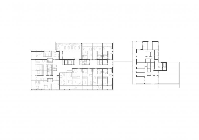 Die vier Pflegewohngruppen umschliessen den neu geschaffenen Hof mit Blick auf den Demenzgarten. Dieser wird zum geschützten, räumlichen Zentrum der Pflegeabteilungen, um den sich die gemeinschaftlichen Aufenthalts-bereiche versammeln. Die Seniorenwohnungen im 2. bis 4. Obergeschoss, als Rückzugsorte mit ausgewogenen Raumproportionen und viel Tageslicht, wechseln sich ab mit erlebnisreichen Erschliessungsräumen. Das spannungsvolle Wechselspiel zwischen Licht und Schatten, zwischen weit und eng, mit attraktiven Ein- und Ausblicken bietet vielfältige Begegnungsmöglichkeiten und hohe Wohnqualität.