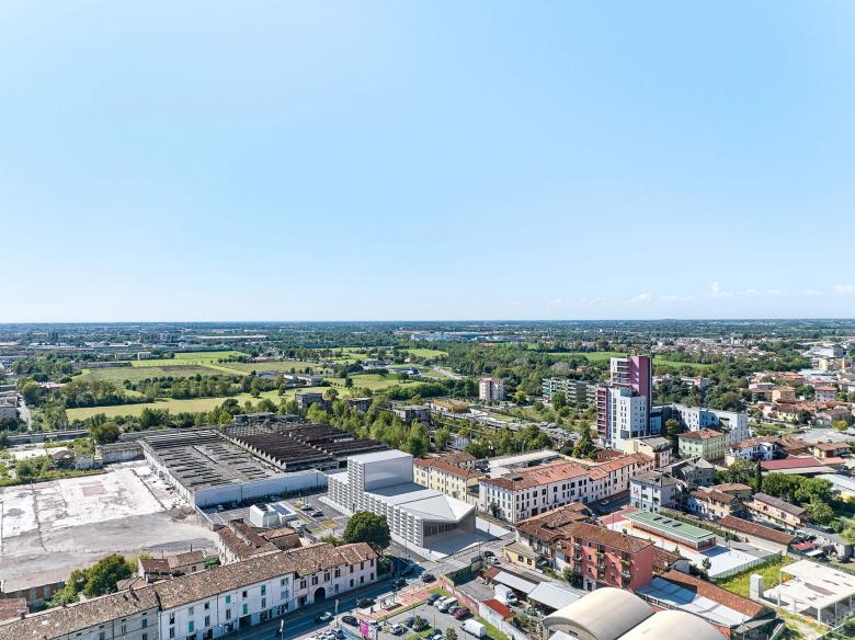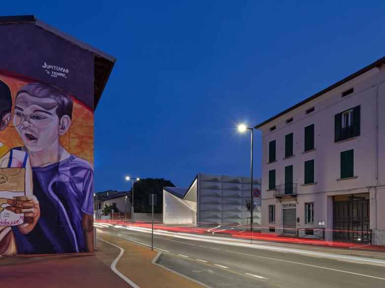 The new theatre represents a central intervention within the broader redevelopment project of Via Milano, called "Oltre la strada." The project aims to redefine the character of the area, establishing itself as a focal point in a zone undergoing transformation, where numerous enhancement projects have been carried out. The architecture, set back from the street line, defines a "civic churchyard" paved with granite and a tree-lined square on the east side, towards the existing residential area. The square is characterized by the ventilation chimneys and the mirrored volume of the plant room located to the south. The redefinition of the surrounding public space becomes central to the enhancement of the area, as important as the value of the built space itself.