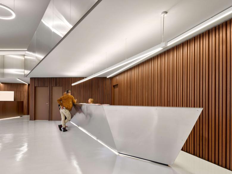 The materials used for the interior include wood for the acoustic wall panels, contrasting with the dark grey plaster and resin floors in the halls, while in the communal spaces, the light grey and wood are complemented by aluminium, used for the staircases, railings, and reception counters, which define the character of the space. An "orange path" leads from the foyer to the children's room, marking and introducing this dedicated space.