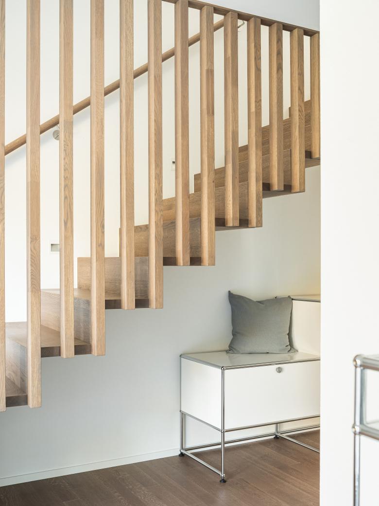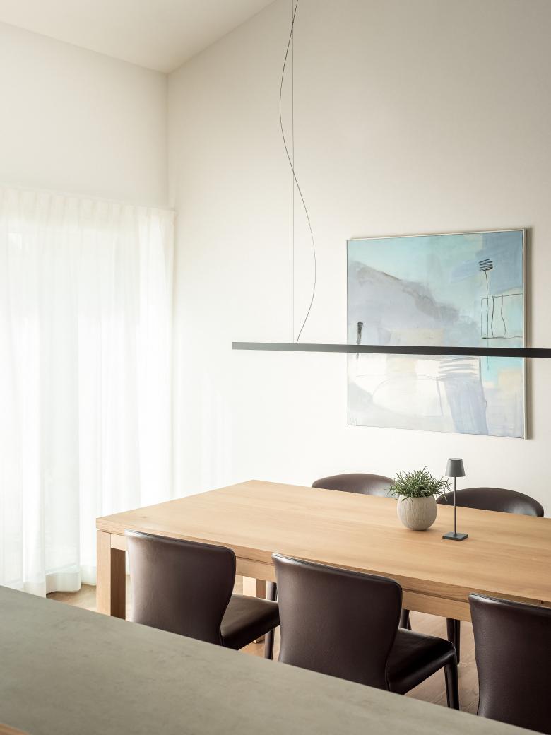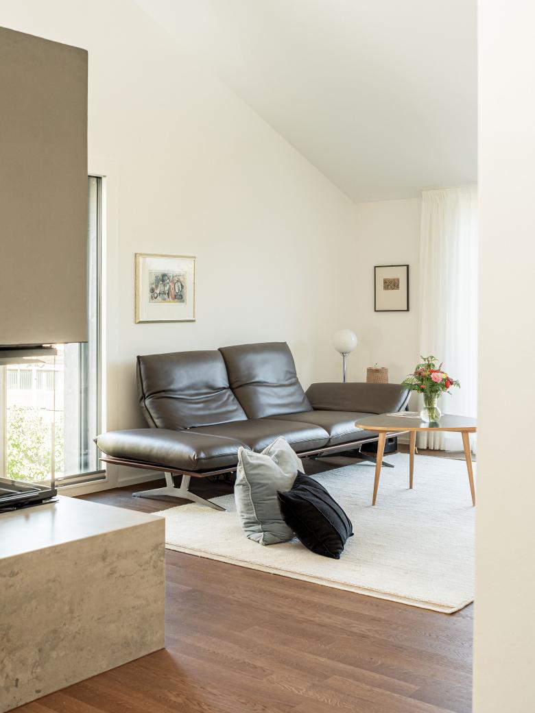 Das Licht ist der stille Hauptdarsteller. Es wandert über den Tag durch grosse Fenster und Oberlichter, wirft Schatten, bringt Bewegung ins Holz. Durch unterschiedliche Raumhöhen entsteht ein Wechselspiel aus Offenheit und Geborgenheit – das Haus wirkt weit, obwohl es kompakt ist.