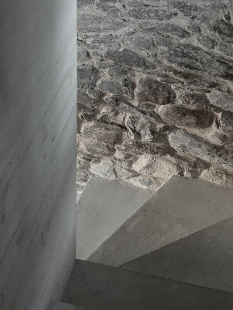 Die Steinwände im Inneren sind in Rasapietra gemauert, der neue Treppen-Kamin-Block besteht aus selbstverdichtendem Beton, mit weißem Zement. Die Elemente aus Holz (Decke und Fußboden des Wohnzimmers, Einrichtung, Türen) sind aus Kastanienholz, ein Material, das schon im vorherigen Gebäudes Verwendung fand. Die Fenster und Türen wurden aus Stahl gestaltet. Die Böden und Wände der Badezimmer sind aus wasserdichtem Mörtel.