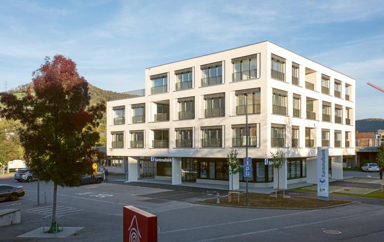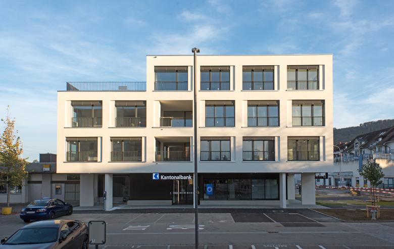 Unten Bank, oben Wohnen. Um zwei Stockwerke erhöht, präsentiert sich das Gebäude der Aargauischen Kantonalbank (AKB) am Widenplatz, im Zentrum von Frick, neu mit fünf Geschossen. Das veränderte Gefüge macht die zweigeteilte Nutzung – mit dunklem Banksockel und hellverputztem Wohnungsteil – in der äusseren Gesamterscheinung ablesbar und bildet ein hochwertiges Gebäude, das sich als städtischer Baustein in seiner Präsenz angemessen behauptet.