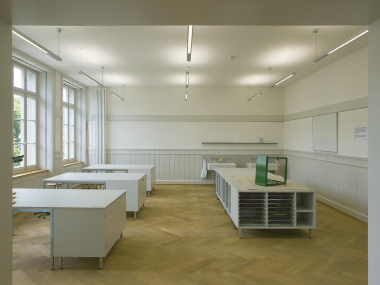 Die Schulanlage Neumarkt wirkt durch die Stellung der Bauten in Reihe und durch den grosszügigen Freiraum zum Schüsskanal im Stadtgefüge sehr prominent. Das unter Denkmalschutz stehende Hauptgebäude wurde als Massivbau mit einem Bruchsteinmauerwerk ausgeführt. Die Decken wurden hauptsächlich aus Holzbalken konstruiert. Nebst der Gebäudehülle war, zusammen mit der nötigen Erneuerung sämtlicher hautechnischen Installationen, auch der ganze Innenausbau des Schulhauses renovationsbedürftig. Der Zustand war schlecht und in gewissen Räumen gar schwer zumutbar. Die nötige bautechnische Sanierung ermöglichte auch die Anpassung der Räumlichkeiten an die heutigen Anforderungen der Schule. Die Raumorganisation wurde geklärt. Alle Klassenzimmer sind analog zur ursprünglichen Idee wieder an der Südfassade angeordnet. Die nördlichen Zimmer wurden mit Nutzungen wie Bibliothek, Gestalten, Mehrzweck- und Gruppenarbeitsräumen belegt. Strukturelle Änderungen waren aufgrund der massiven Bruchsteinkonstruktion kaum möglich. Grössere Eingriffe in den Rohbau bedingten einzig der Einbau eines Personenliftes und die Verlegung der WC-Anlagen. Diese sind neu zentral am Treppenhaus angeordnet und geben so die schönen, über Eck befensterten Räume an den Enden der Korridore frei. In Einklang mit der angestrebt behutsamen Sanierung konnte die ursprüngliche Substanz inklusive Innenausbau soweit wie möglich erhalten bleiben. Spätere, unpassende Einbauten wurden entfernt. Das 120-jährige Gebäude hat seinen durch das Alter geprägten Charakter und die ursprünglichen Raumstimmungen behalten, respektive wiedererlangt.