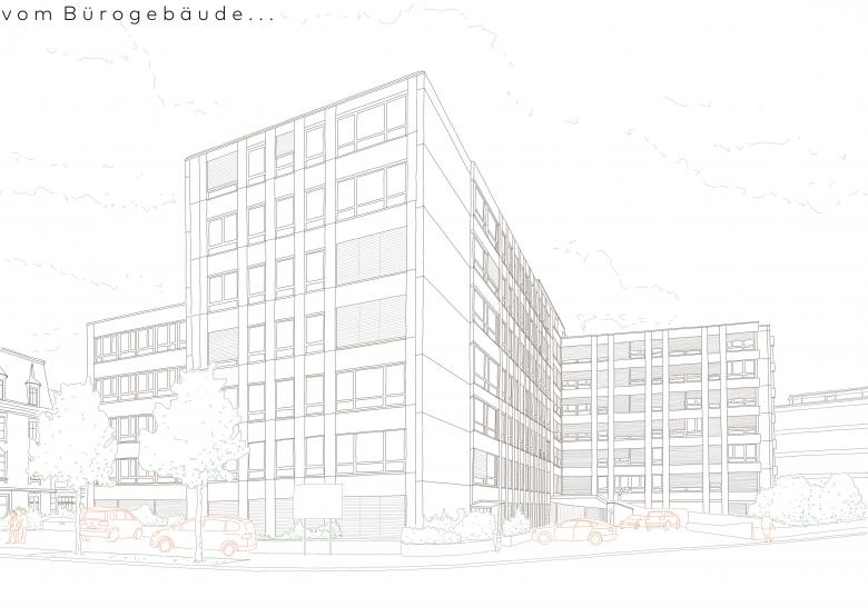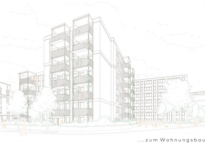 Das Verwaltungsgebäude an der Kasernenstrasse 19/21 entstand in den Jahren 1966/67. Geplant ist die Transformation zu einem Wohngebäude. Für die Umnutzung wird das Gebäude bis auf die Rohbaustruktur zurückgebaut.