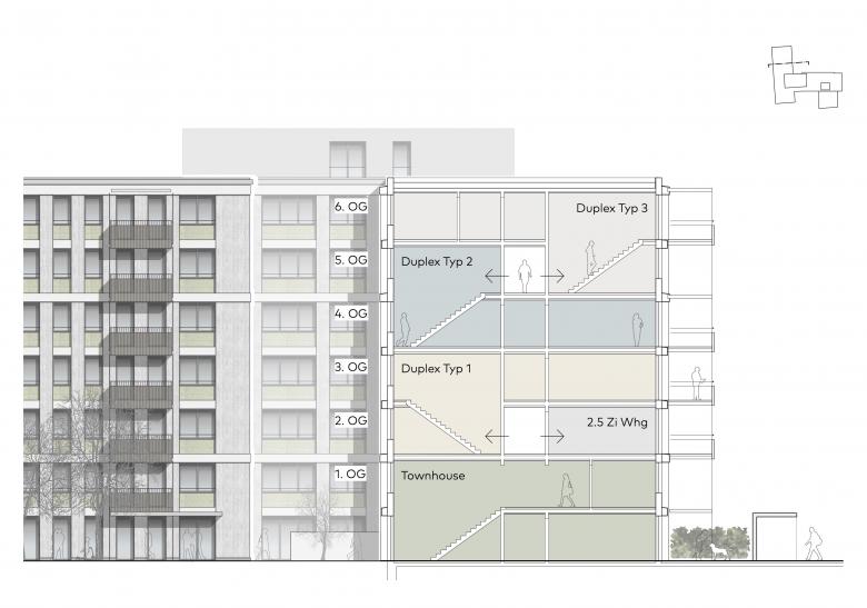 Innovative, massgeschneiderte Wohnungsgrundrisse ermöglichen die effiziente Umnutzung unter Erhalt der Bestandesstruktur. Der Wohnungsmix beinhaltet zukünftig 89 Wohnungen vom 1 ½-Zimmerstudio bis hin zur 4 ½-Zimmerwohnung. Sieben Ateliers im Erdgeschoss ergänzen die Wohnnutzung. Rund 85% der Wohnungen sind eingeschossig, 15% der Wohnungen werden zweigeschossig als Townhouses und Duplex konzipiert. Durch neue, vorgelagerte Balkone erhalten die Wohnungen private Aussenräume.