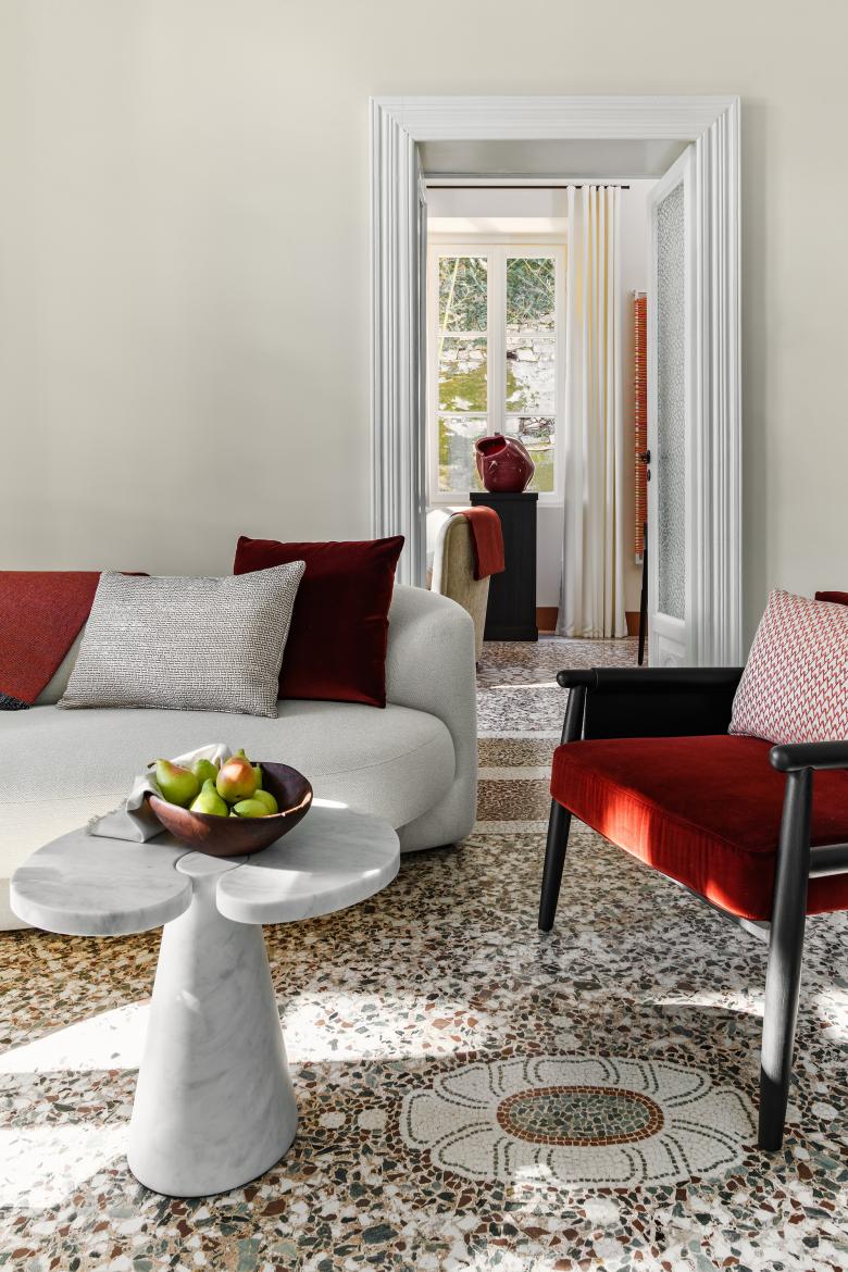 All of the bedrooms have sweeping views out over the gardens and Lake Como, and beg one to sit and linger. Custom linens were designed with a logo created using the same flower motif used in the new terrazzo floors, based upon one of the original mosaic rosettes.