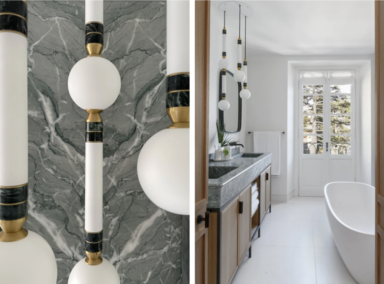 The bathrooms feature a beautiful green Verde Antiqua stone used to create accent walls, as well as the carved stone tops on custom designed vanities. Light fixtures by Marc Woods give the room a pop of elegance.