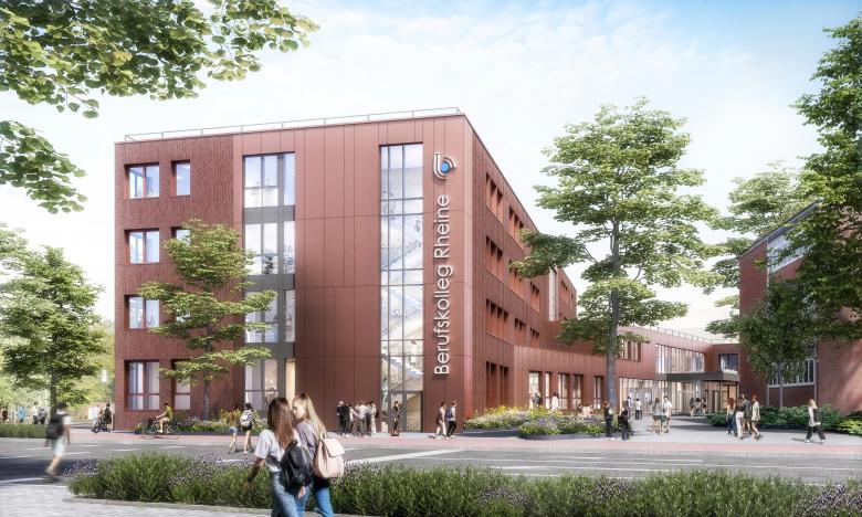 Durch das Sanierungs- und Neubauprojekt wird das Berufskolleg Rheine sein breitgefächertes Bildungsangebot künftig an einem zentralen Ort anbieten können. Im Zentrum des Entwurfs steht ein ganzheitliches Raumkonzept, das die Bedürfnisse der über 2.300 Schüler:innen in den Fokus rückt, die hier auf ihre berufliche Zukunft vorbereitet werden. Die Anbindung des Neubaus an das bestehende Berufskolleg wurde so konzipiert, dass eine einheitliche Adresse für den gesamten Campus entsteht.
