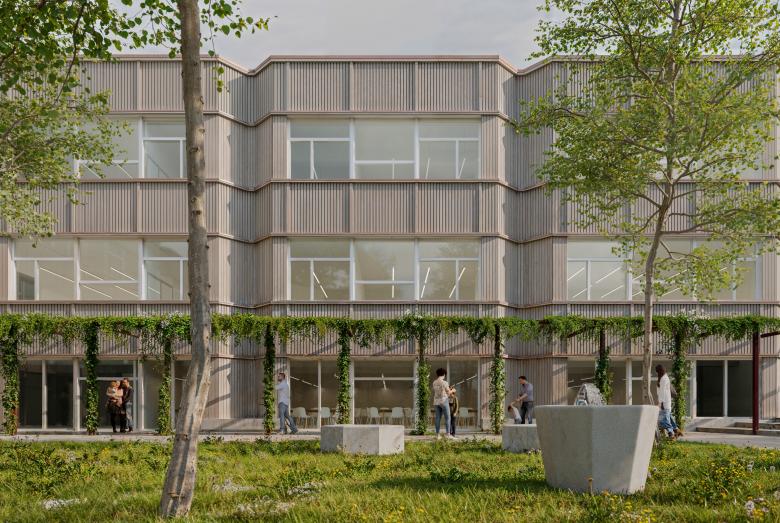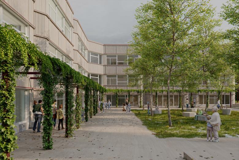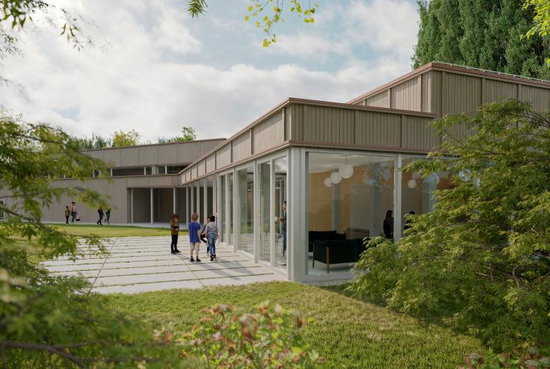 Der Pausenhof wird auf Niveau des schlecht belichteten Untergeschosses abgesenkt. Freigeschält und befreit von den diversen Treppenanlagen entsteht ein vollwertiges neues Eingangsgeschoss, welches die Erschließungssituation substanziell verbessert und dem Gebäude zu einem zeitgemäßen Ausdruck verhilft. Der nun ebenerdige Zugang schafft Raum und Durchlässigkeit entlang der flankierenden Gebäudeflügel, in denen nun großzügig und hell Aula, Speisesaal und Mehrzweckraum untergebracht werden. Ihnen vorgelagert wird eine leichte, begrünte Pergolakonstruktion, welche die Nutzungen in den Freiraum erweitert und schattige Aufenthaltsflächen bietet.