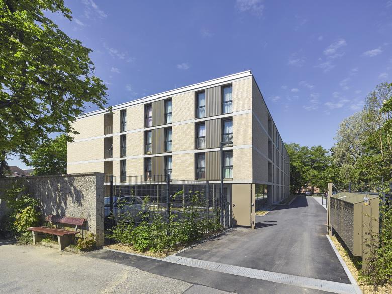 Die Erschließung des Gebäudes erfolgt barrierefrei über die Straße Auf der Schanz. Im Erdgeschoss befindet sich das barrierefreie Zimmer, erste Einheiten der Studentenappartements, der Gemeinschaftsraum für die Bewohner, sowie ein großzügiger Ankommensbereich. Die geschickte Anordnung der vier Bausteine entlang der Außenseiten des Gebäudes ermöglicht das Aufbrechen des Volumens. Über zwei vertikale Erschließungen gelangt man in die darüber liegenden Geschosse. Über den Innenhof ist für die Bewohner stets die Möglichkeit zur Kommunikation und zum Verweilen gegeben. Die Appartements sind klar und einheitlich strukturiert. Sie verfügen über zwei Zonen, dem Eingangsbereich mit Küchenzeile und Nasszelle sowie dem Wohnraum.