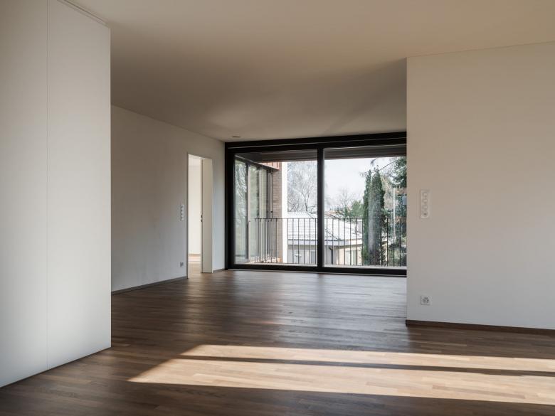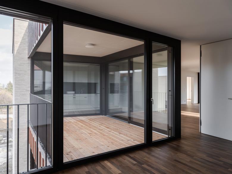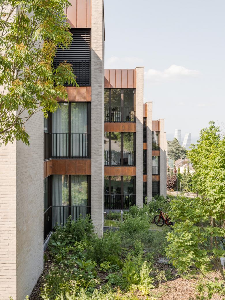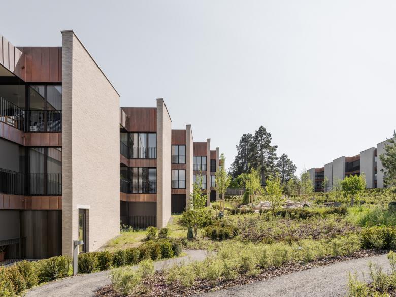 Die Überbauung liegt auf dem Bruderholz, Basel südlichstem Quartier und gleichnamigem Hügel, welcher sich mehrere Kilometer Richtung Süden zieht. Das beliebte Wohnquartier ist geprägt von der Siedlungstypologie der Reiheneinfamilienhäuser, welche um die Tiefe eines Vorgartens von der Strasse zurückweichen. Nach achtzigjähriger Nutzung des Areals als Campus des Radios und dessen Umzug ins Stadtzentrum wurde es frei für die vom Kontext inspirierten Wohnungsbauten. Entlang der Schäublin- und der Marignanostrasse orientieren sich zwei dreigeschossige Zeilenbauten, welche sich in der Höhenstaffelung wie auch in der Geometrie der Grundrissfigur mimetisch den morphologischen und topografischen Gegebenheiten anpassen. Die aus dem Kontext konzipierten Baukörper werden in ihrer Längsstruktur stark gegliedert, um der Massstäblichkeit bzw. der Parzellenstruktur der umgebenden Bauten mit Respekt zu begegnen. Die nord-süd gerichteten Zeilen ermöglichen ost-west orientierte Wohnungen. Durch die Ausarbeitung einer spezifischen räumlichen Disposition in Verbindung mit einer differenten Orientierung der einzelnen Räume erhalten die Wohnungen eine grosse Offenheit bei gleichzeitiger Intimität. Indem das Treppenhaus mit den Individual- und Funktionsräumen in Form von kompakter Sequenzen angeordnet ist, bietet sich die Möglichkeit die Kollektivräume als grosszügiges Raumkontinuum ineinander und über die Klimagrenze hinweg fliessen zu lassen. So wird auch die parkartige Landschaft zwischen den Zeilen essentieller Teil der inneren Raumerfahrung. Die strukturelle Gliederung der Wohnungen mit offenen und geschlossenen Sequenzen bestimmt auch die Komposition der Fassaden. Homogene, geschlossene Fassadenwände aus hellen Klinkersteinen wechseln sich ab mit kontrastierenden, tiefen und offenen Loggia-Partien aus Kupfer und dunklem Metall. Die ondulierenden Baukörper verzahnen sich eng mit dem Grünraum, dessen Konzept an die Ausgangslage des Bestandes anknüpft und ein begehbares Bild schafft: Ein durchgängiger, durch die Anwohner nutzbarer Ort mit attraktiver Aussicht, der vom Wasser geprägt ist und zum Verweilen einlädt.