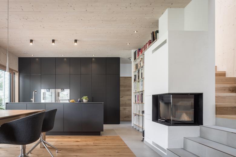 Selbstverständlich und unaufgeregt fügt sich Haus Engel in die Wohnbebauung der beschaulichen Gemeinde Gräfelfing im Landkreis München ein. Das Massivholzhaus, das wir entworfen haben und das HBH Holzbau aus Landau umgesetzt hat, wurde für eine Kleinfamilie gebaut; die Großeltern wohnen direkt nebenan. Die Herausforderung bestand darin, innerhalb dieses kleinen Volumens relativ großzügige Räume zu schaffen. Zwar zeigt sich Haus Engel bescheiden – auch mit seiner Grundfläche von 180 Quadratmetern –, doch durch offene Grundrisse, den freien Treppenaufgang samt Oberlicht und die spezielle Lattenführung an der Fassade entwickelt es eine aparte Ausstrahlung im Detail. Gebaut wurde es für einen bekannten Münchner Koch und seine Partnerin, eine ebenso bekannte Konditorin. Allein deshalb ist die freistehende, von einem Schreiner gefertigte Küche mit High-End-Geräten ausgestattet – was man allerdings nicht sieht, da alles hinter Oberflächen verschwindet. So wirkt das Haus stets aufgeräumt.