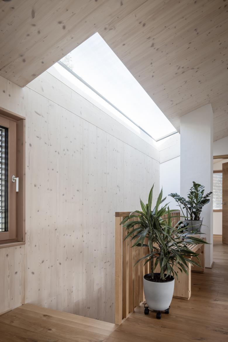 Innen präsentiert sich das Haus charmant und gleichzeitig clean. Während sich im Erdgeschoss die öffentlichen Bereiche mit offener Küche, Ess- und Wohnbereich sowie ein Gästezimmer befinden, gelangt man über die Treppe in den privaten Bereich im ersten Obergeschoss mit Elternschlafzimmer und Kinderzimmer, das bis zum First ausgebaut ist. Teile der Holzkonstruktion im Inneren wurden weiß lasiert, um den natürlichen Ausdruck etwas zu reduzieren. Die Möblierung stammt größtenteils aus dem Bestand der Bauenden und konnte harmonisch integriert werden. Insgesamt wirkt die Atmosphäre lebendig und warm. Das Haus wurde im Passivhausstandard gebaut und wird über eine Wärmepumpe beheizt. Der Einsatz von regionalem Holz, kurze Lieferwege und viele natürliche Materialien machen das Wohngebäude der jungen Familie zeitgemäß und nachhaltig.