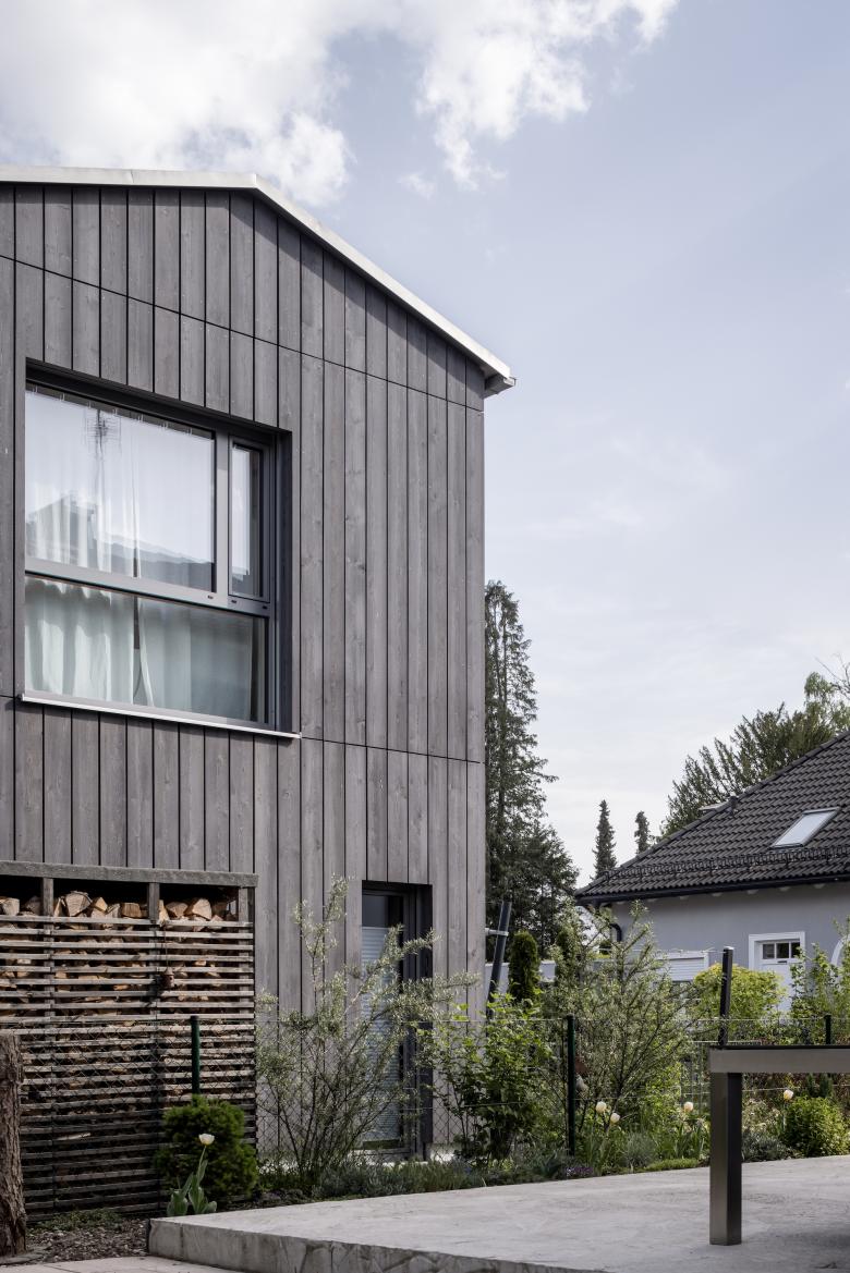 Durch die Massivholzwände aus Brettschichtholz erhält das Haus einen robusten Schallschutz. Den Wandaufbau haben wir gemeinsam mit dem Holzbauer entwickelt: Es kommen neun Zentimeter starke Holzplatten zum Einsatz, auf die zusätzlich eine Dämmung aus Holzwolle sowie die Unterkonstruktion für die Fassade aufgebracht werden. Die Wandelemente wurden fertig montiert – inklusive Haustechnik, Fenstern und Türen – auf die Baustelle geliefert, wo das Haus in nur einer Woche errichtet wurde. Insgesamt dauerten die Bauarbeiten etwa sechs Monate. Dies erforderte eine enge, präzise und gut getaktete Zusammenarbeit mit HBH Holzbau. Die Fassade aus Fichte mit Vorvergrauungslasur wird im Laufe der Zeit durch Verwitterung auf natürliche Weise ergrauen, allerdings mit mehr Unregelmäßigkeiten. Das Spiel aus vertikaler und horizontaler Lattung an den unterschiedlichen Außenfassaden erzeugt eine interessante Spannung.