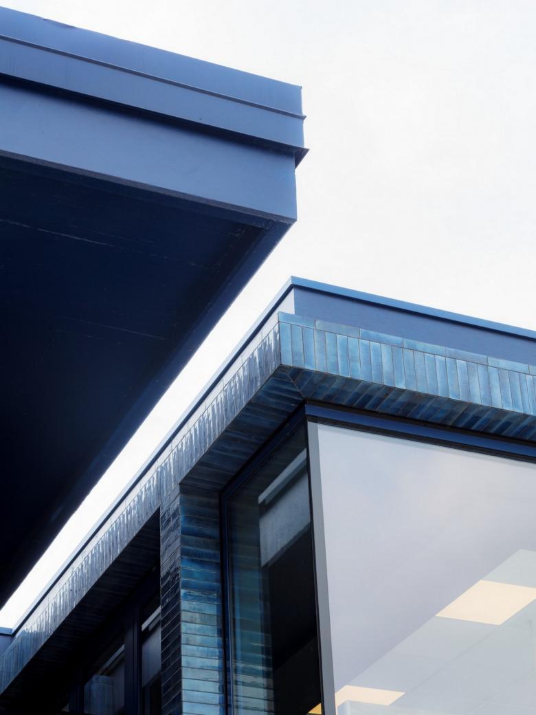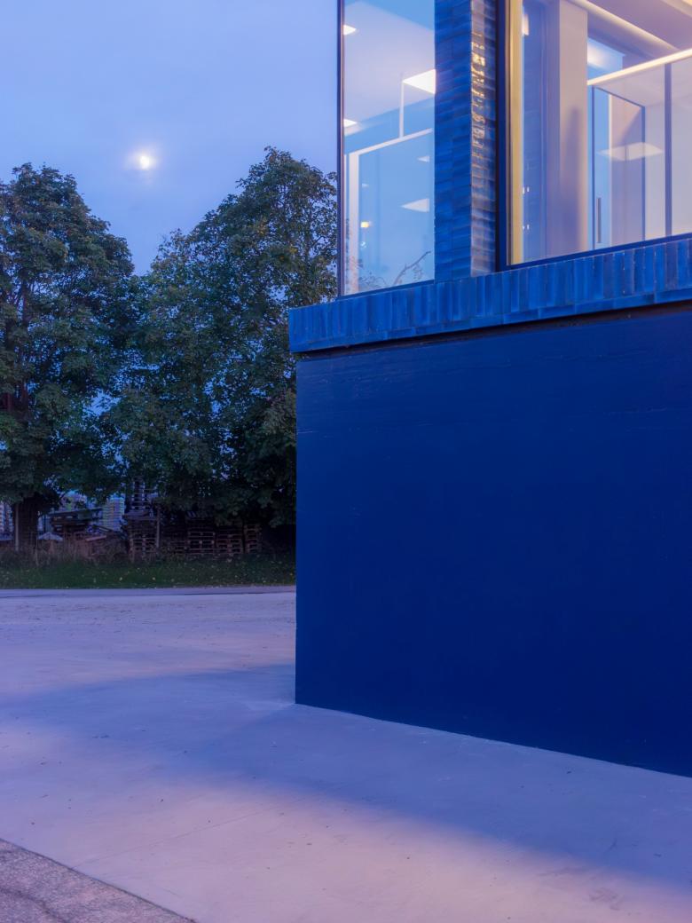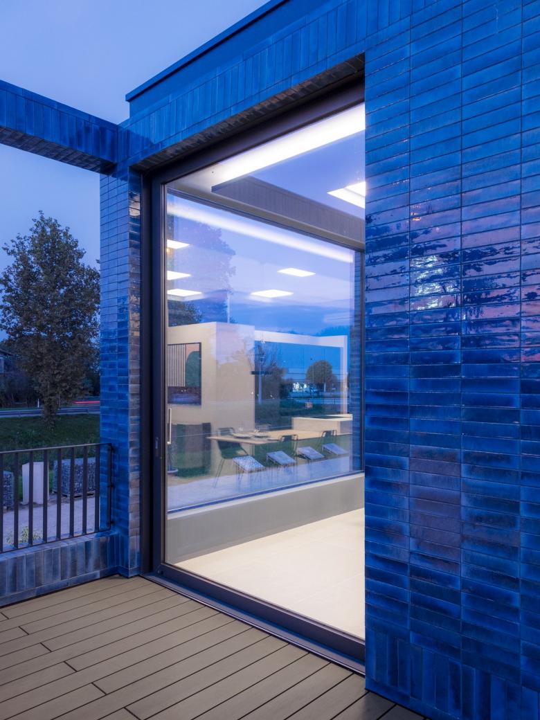 Un piccolo giardino frontale bilancia il vuoto del terrazzo, introducendo una nota di imprevedibilità. La semplicità dell’impianto formale dialoga con la complessità vibrante del rivestimento ceramico, che rifrange la luce in modi sempre diversi. Il blu, colore identitario dell’azienda, si declina nei materiali e definisce l’immagine complessiva. Di notte, lo showroom diventa una lanterna luminosa che accompagna il paesaggio stradale.