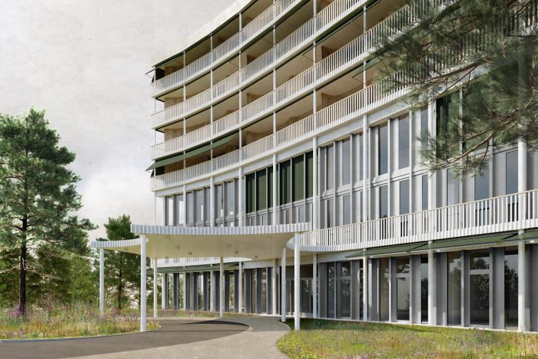 Der fünfeckige Baukörper sitzt selbstbewusst auf einer Hügelkuppe des Faltigberges und bietet eine herausragende Rundumsicht. Konkave Fassaden fassen auf sanfte Art den Landschaftsraum. Ein Atrium verbindet das Eingangsgeschoss mit dem doppelgeschossigen «Piano nobile», wo das Therapie- und Diagnostikzentrum untergebracht ist. Darüber entwickeln sich die Bettengeschosse um einen offenen Innenhof. Eine umlaufende, feingliedrige Balkonschicht vor den Zimmern verleiht dem Baukörper einen filigranen Ausdruck.