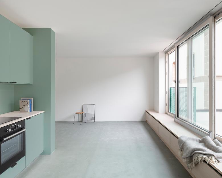 Die drei Wohneinheiten verfügen jeweils über denselben Grundriss: ein Einraum, welcher durch einen rückwärtigen Einbau für Bad und Ankleidebereich mit Stauraum unterteilt wird.