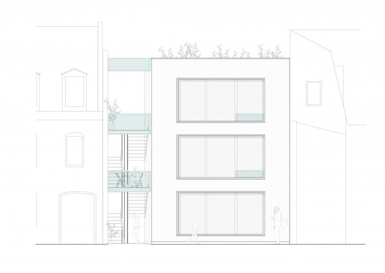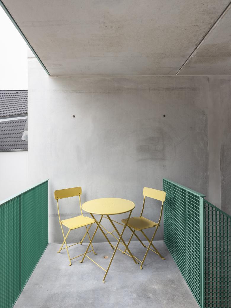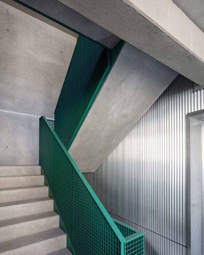 Die Erschließung der Wohneinheiten erfolgt über ein außenliegendes, freistehendes Treppenhaus. Die tiefen Treppenpodeste dienen zusätzlich als Freibereiche für die Bewohner*Innen mit Blickkontakt zum Hof.