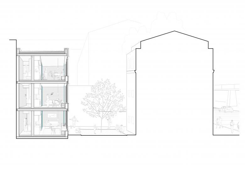 Das Gebäude fügt sich in seiner Kubatur in den von drei Seiten umbauten Bauplatz ein. Auf dem Grundstück entsteht somit zwischen bestehendem Vorderhaus und neuem Hinterhaus ein Hof, der von allen Bewohner*Innen genutzt werden kann.