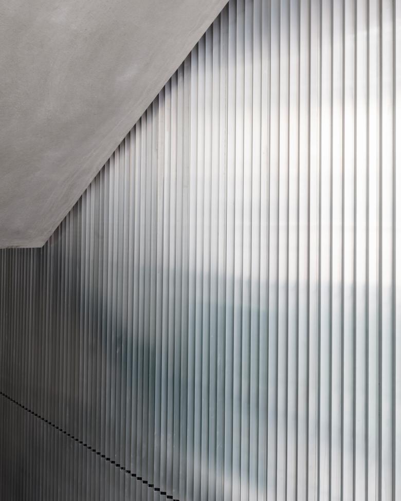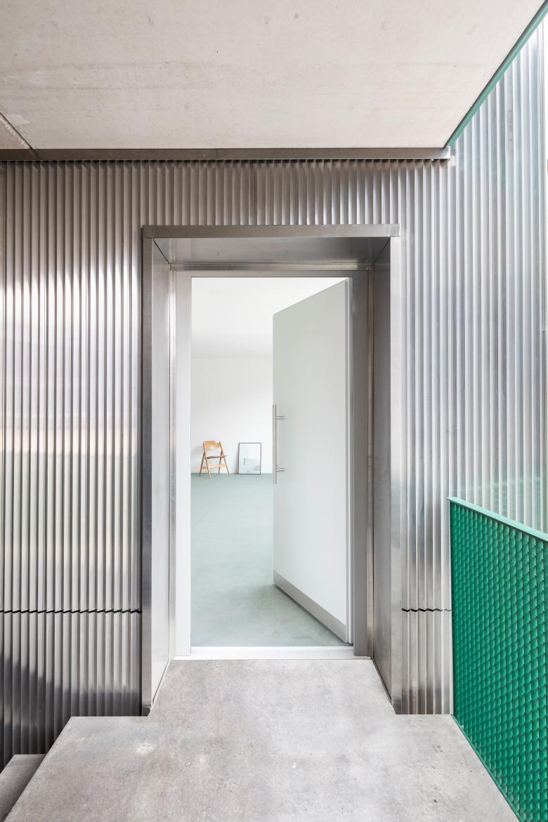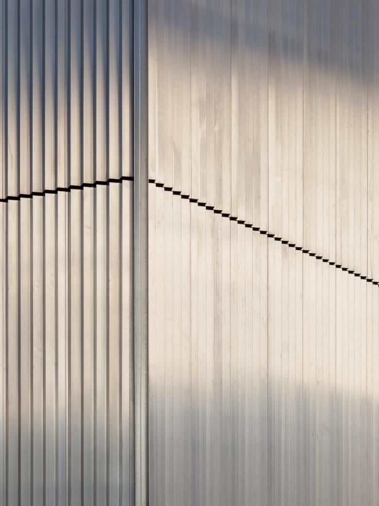 Das Gebäude erhält eine Fassadenverkleidung aus blankem Aluminium in gezackter Form, welche es stark vom Kontext absetzt und zu einem eigenständigen Baukörper werden lässt. Diese helle Fassade strahlt auf den Innenhof ab und gibt ihm zusätzliche Helligkeit. Gleichzeitig nimmt sie aber auch die Farben der Umgebung und des Himmels auf und erscheint jeden Tag etwas anders.