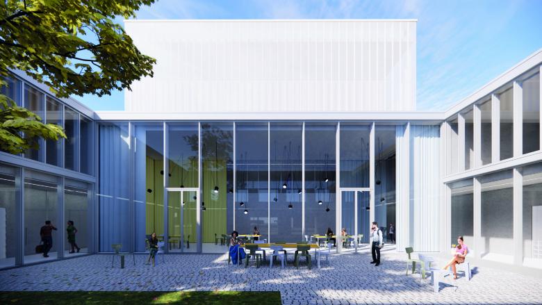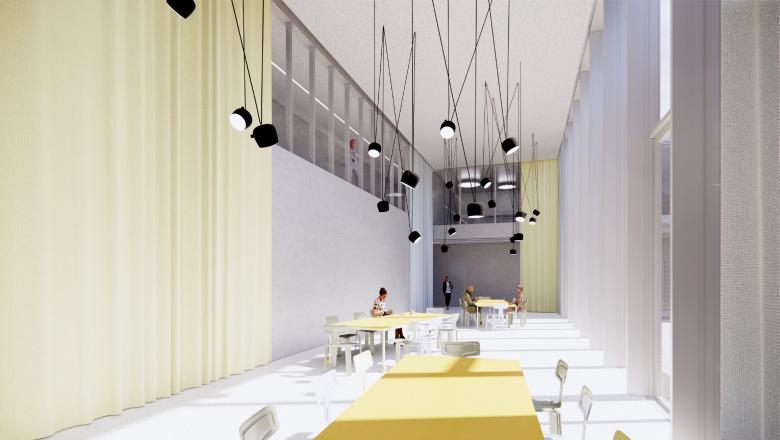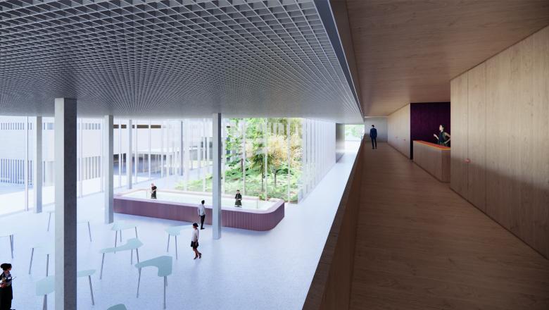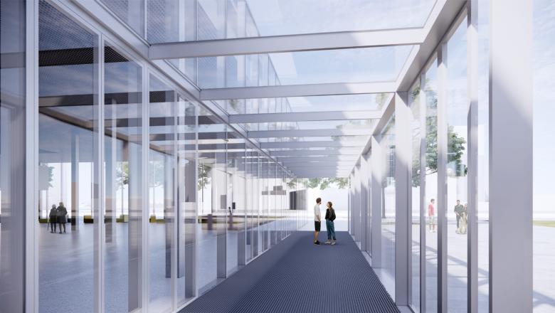 Der Übergang zwischen Bestand und Neubau wird mit dem bereits bekannten Element des Atriums geschaffen. Es lenkt die Besucher um, markiert den Übergang und wird als besonderer Ort noch einmal betont.