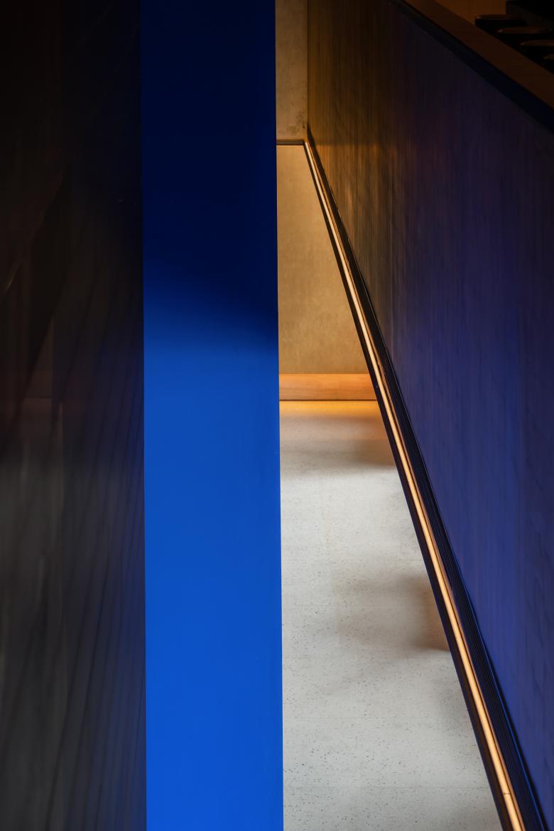 The blue curved doors are wrapped in a kind of traditional Chinese fabric hand-dyed by experienced craftsmen, which is characterized by high chroma. Hand-dyeing is a traditional craft, and different batches of cloth dyed manually have different shades. At the center of the space erects a high wall, which features an "orthodox" blue color, seeming to declare the fabric covering’s unadulterated quality in an uncompromising way.