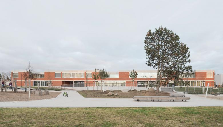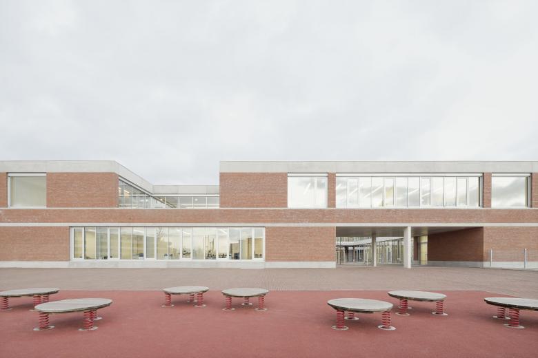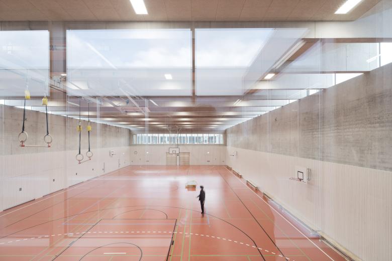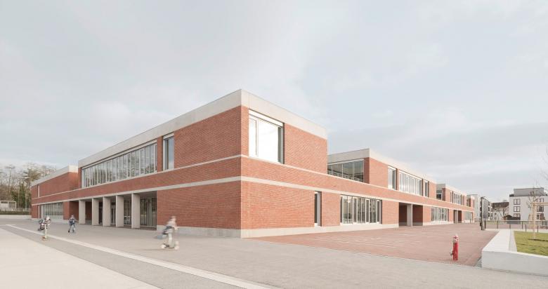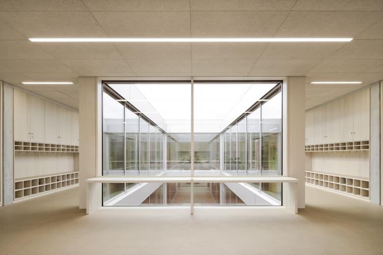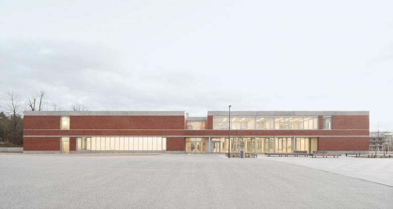 Schule und Kindertagesstätte sind zu einem Baukörper zusammengefügt, jedoch auch eigenständig ablesbar. Durch die ebenengleiche Anordnung aller Klassen wird der Austausch der Schüler zwischen den Jahrgangsstufen und so das Lernen von- und miteinander gefördert. Die Klassenräume öffnen sich zu den pädagogisch vielfältig nutzbaren, räumlich differenzierten Lernzonen. So entstehen unterschiedliche Bereiche, die selbstorganisierten, offenen wie auch abgeschlossenen Wissenserwerb, Lernen und Arbeiten alleine oder in der Gruppe ermöglicht. Die Gruppenräume der Kindertagesstätte sind L-förmig um zwei Lichthöfe angeordnet und zu den zugehörigen vorgelagerten Freiräumen orientiert.