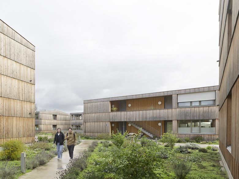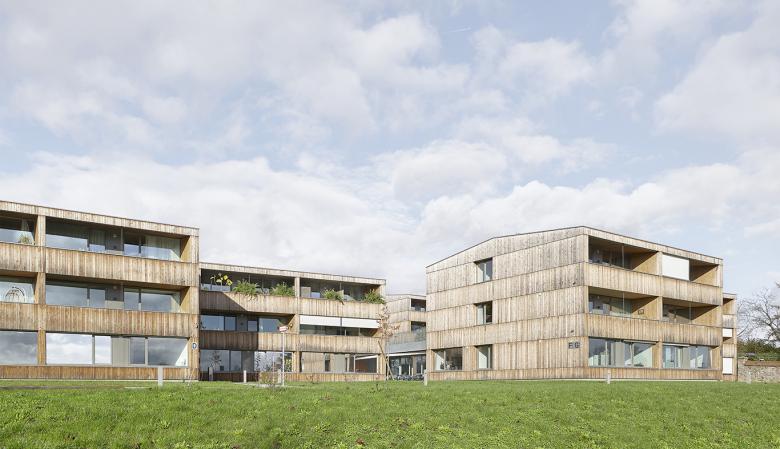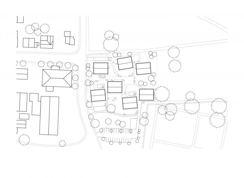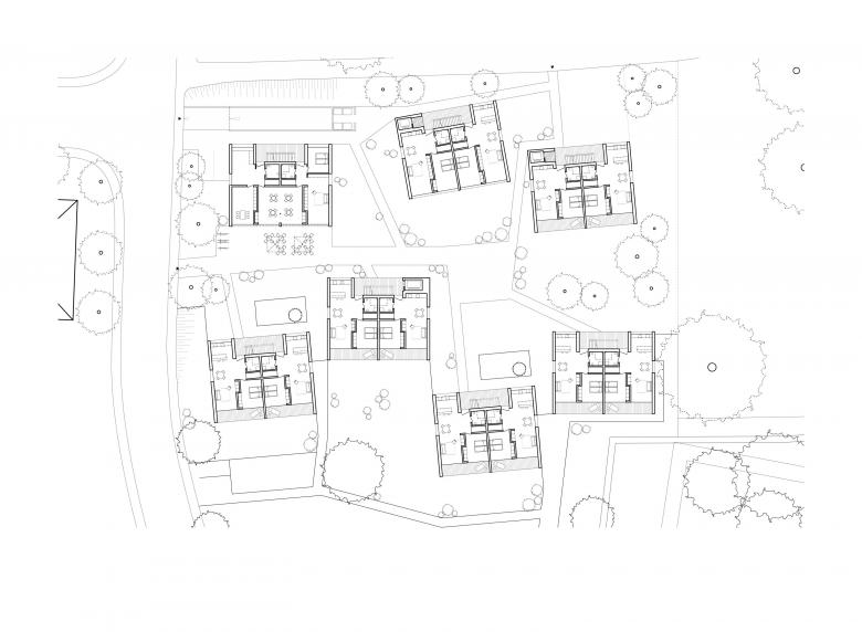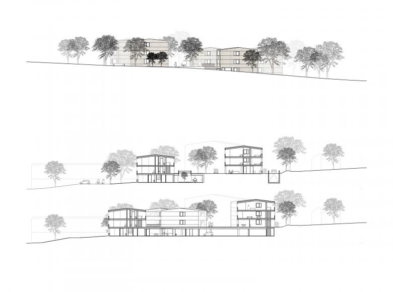 In zentraler Lage entsteht ein inklusives Wohnkonzept als Lebensort für Studenten, Senioren und Menschen mit Behinderung. Hier werden Menschen mit und ohne Betreuungsbedarf selbstständig und zugleich miteinander wohnen. Damit wird umfassende Teilhabe am gesellschaftlichen Leben möglich. Bewusst wird die offene Bauweise der umgebenden Wohnbebauung fortgeführt und das inklusive inhaltliche Konzept somit baulich umgesetzt. Die Wohnungen unterschiedlicher Größe für alleinstehende Menschen und Lebensgemeinschaften werden in 7 freistehenden, spielerisch angeordneten Baukörpern konzipiert. Die Geländeneigung wird genutzt, um eine Pflegestation mit zwei Gruppen à 12 Bewohner zu integrieren.