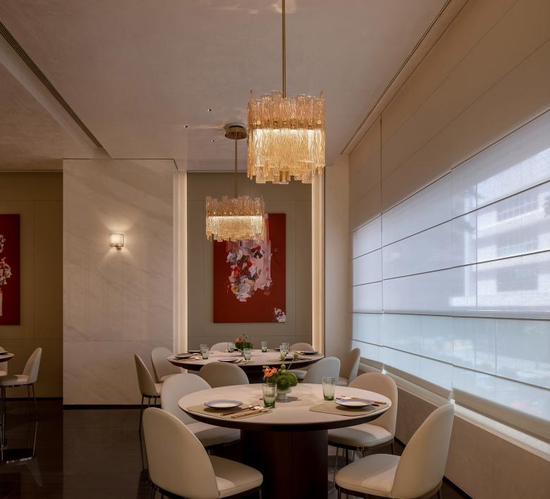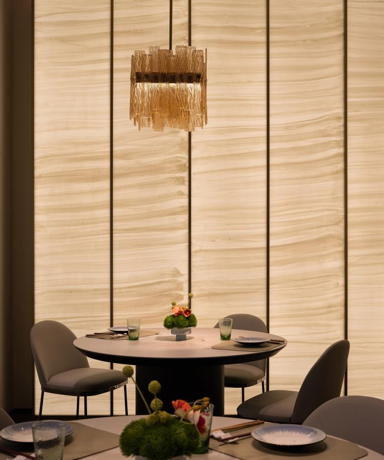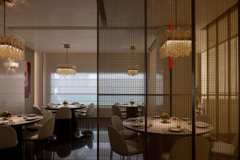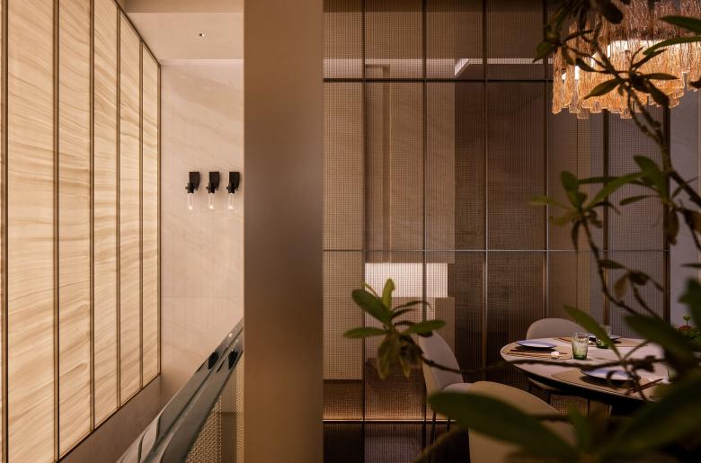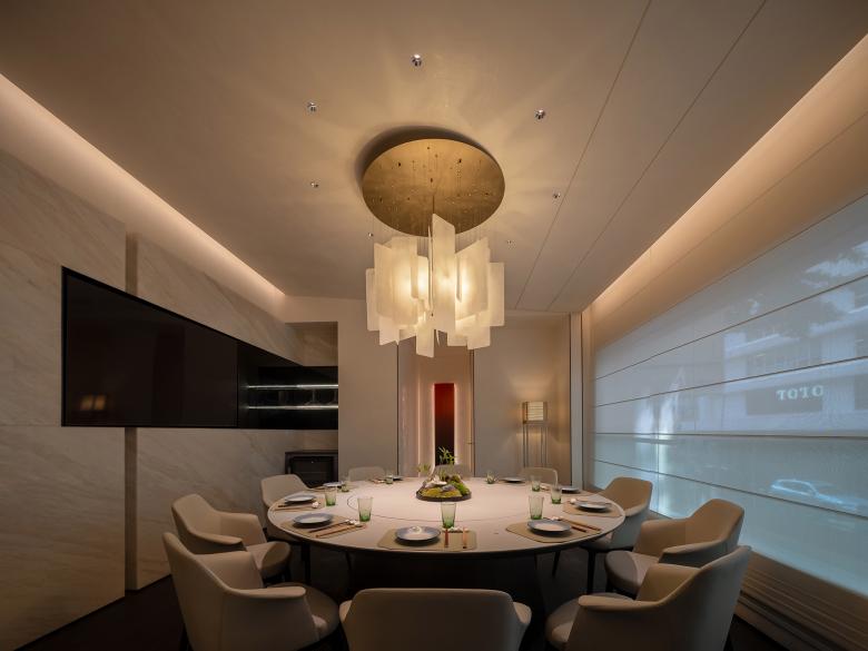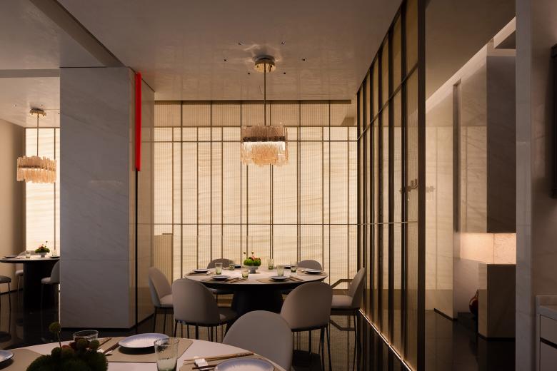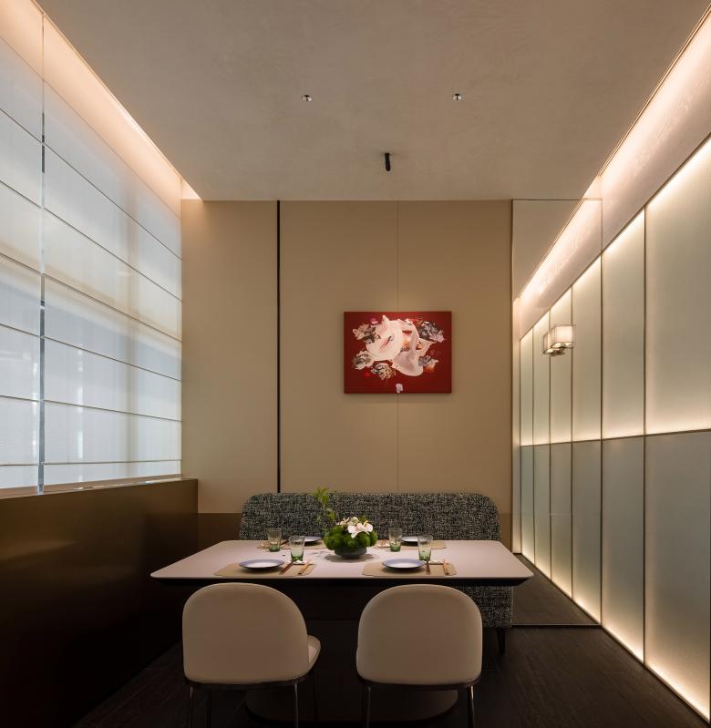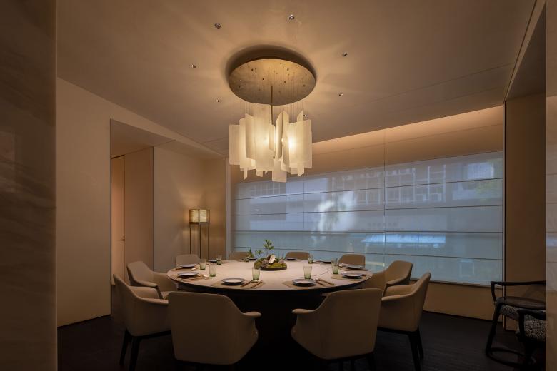 The 300-square-meter dining area houses seven private rooms and a total of 76 seats—an impressive feat for a high-end restaurant. AD ARCHITECTURE meticulously managed spatial proportions and de-emphasized the pre-dining lounge area for enhancing cost-effectiveness.