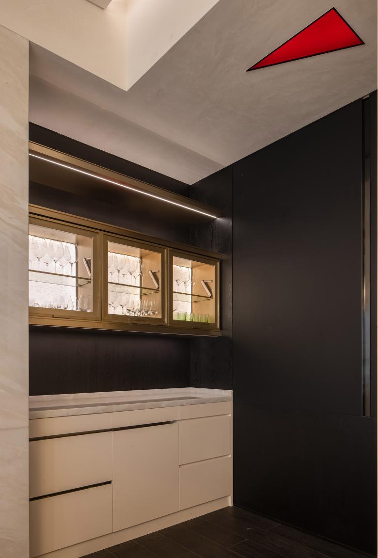 Situated on Lockhart Road, the restaurant has a modestly sized facade. To maximize its visual impact, AD ARCHITECTURE utilized half of the facade for a seafood ingredients display tank. This design invites passersby and incoming guests to first encounter the restaurant’s premium seafood selection, reinforcing Hip Seng’s culinary philosophy and brand identity. The inclusion of a wine cabinet further showcases the brand’s refined dining and wine culture.