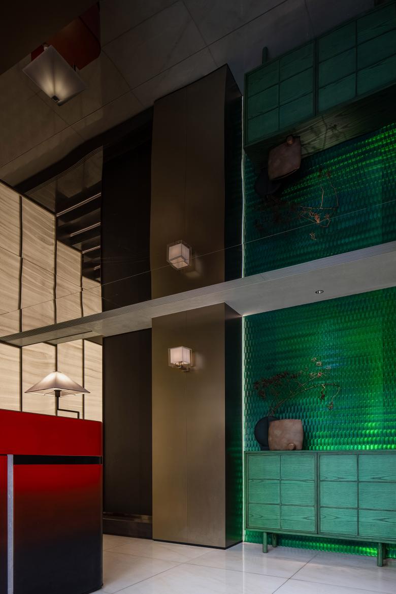 Brass textures dominate the facade, complemented by the eye-catching contrast of green glazed glass and a gradient red reception desk visible through the entrance, effectively drawing passersby even within the constraints of a narrow pedestrian street.