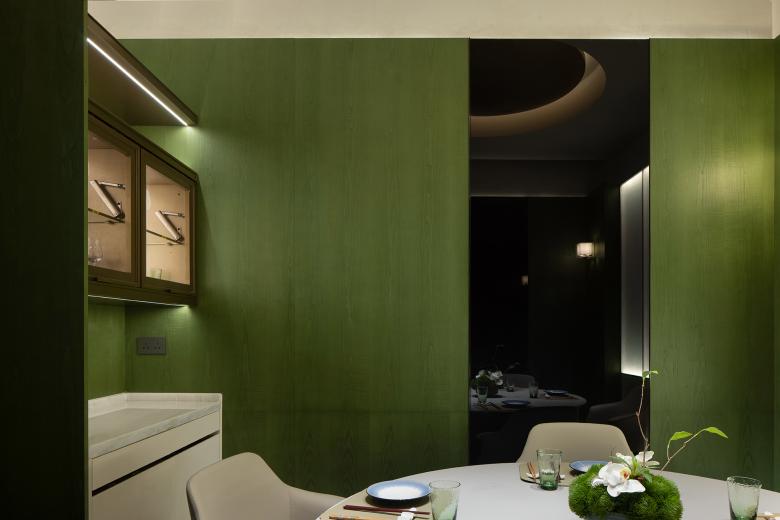 The private dining rooms maintain a cohesive design language while incorporating distinct color palettes and design elements for each room, to create a diverse yet unified aesthetic.