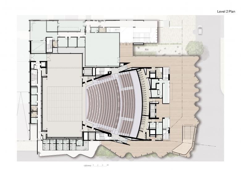 The brief had anticipated that two protruding existing rehearsal studios would need to be demolished to fit the new building, however we managed to retain them in the design, and provide two additional rehearsal studios under the rake of the theatre. This gave QPAC an asset the client wasn’t expecting and helped solve an existing deficiency. Our idea for the new studios—now also seen as flexible performance spaces—was to enable them to be viewed into from the neighboring streets as a further means of making the performing arts feel more accessible than conventional theatres like the QPAC theatres. However, the studios will only be complete in mid-2027.
