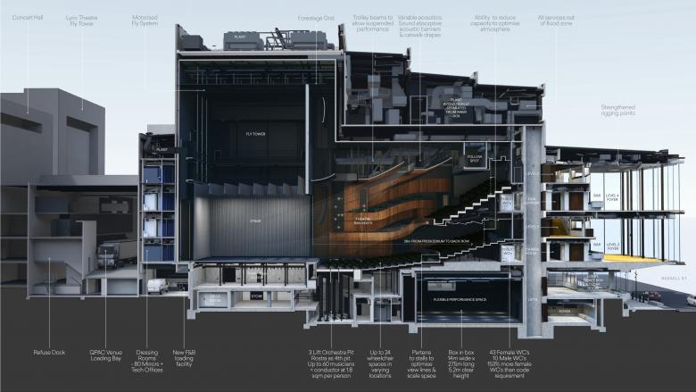 From a user perspective, the key driver was to make the theatre as intimate as possible both for performers and audience. The furthest seat is only 28m from the stage and balconies are wrapped around the sides to achieve this outcome.
