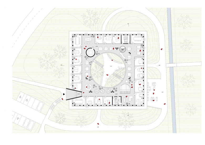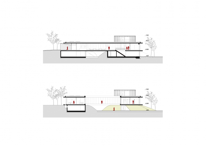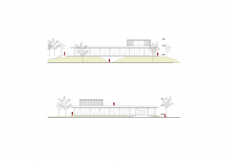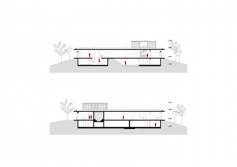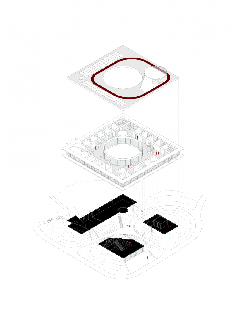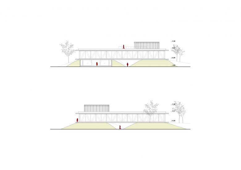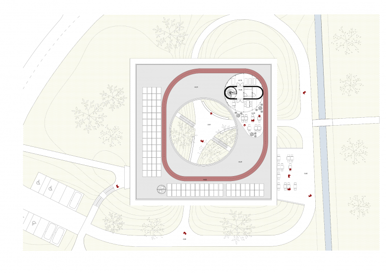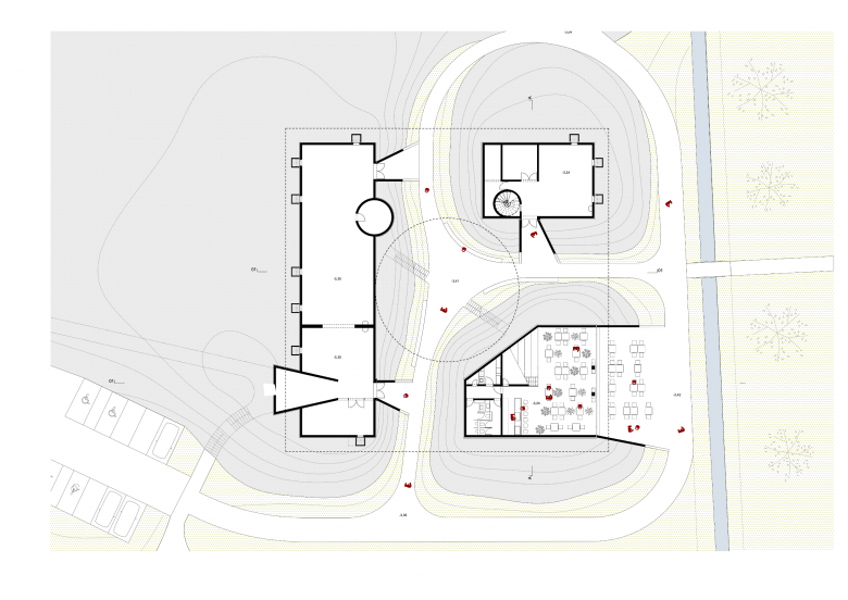 The site was a crucial impact for the concept. It was a former construction material depot, containing piles of excavated soil and waste from other construction sites. Along with a mild natural slope, the site topography was constantly changing. And these constant changes encouraged us to establish a new topography with three inhabited mounds ‘carrying’ the one-story building.